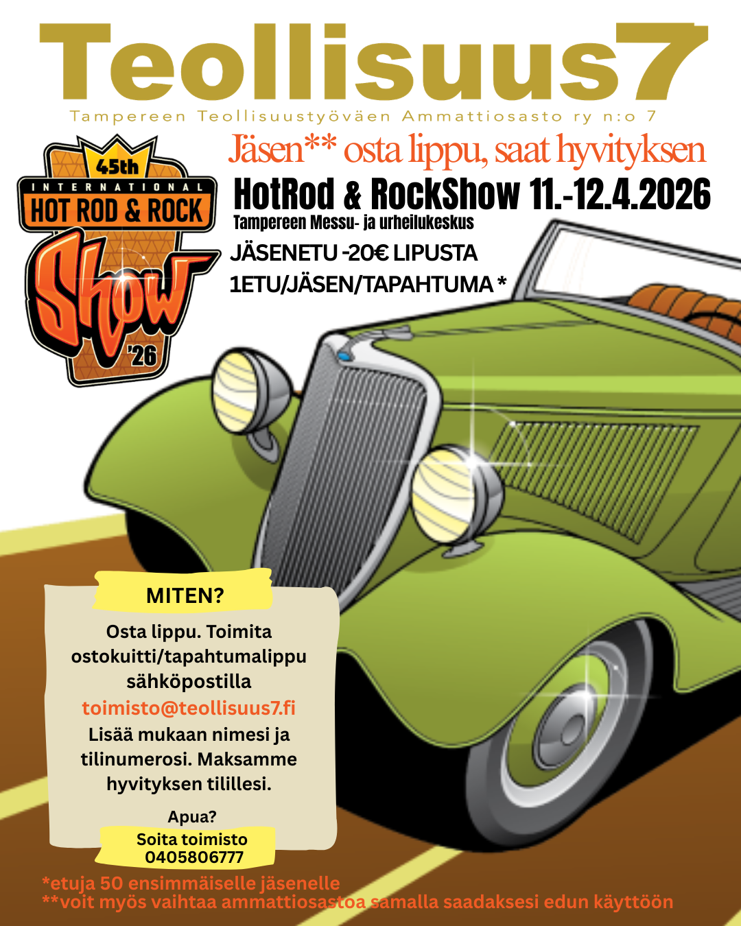 TEOLLISUUS SEISKA TUKEE JÄSENTENSÄ OSALLISTUMISTA  HOTROD & ROCKSHOW TAPAHTUMAAN 11.-12.4.2026  20€/JÄSEN. (50 NOPEIMMALLE)